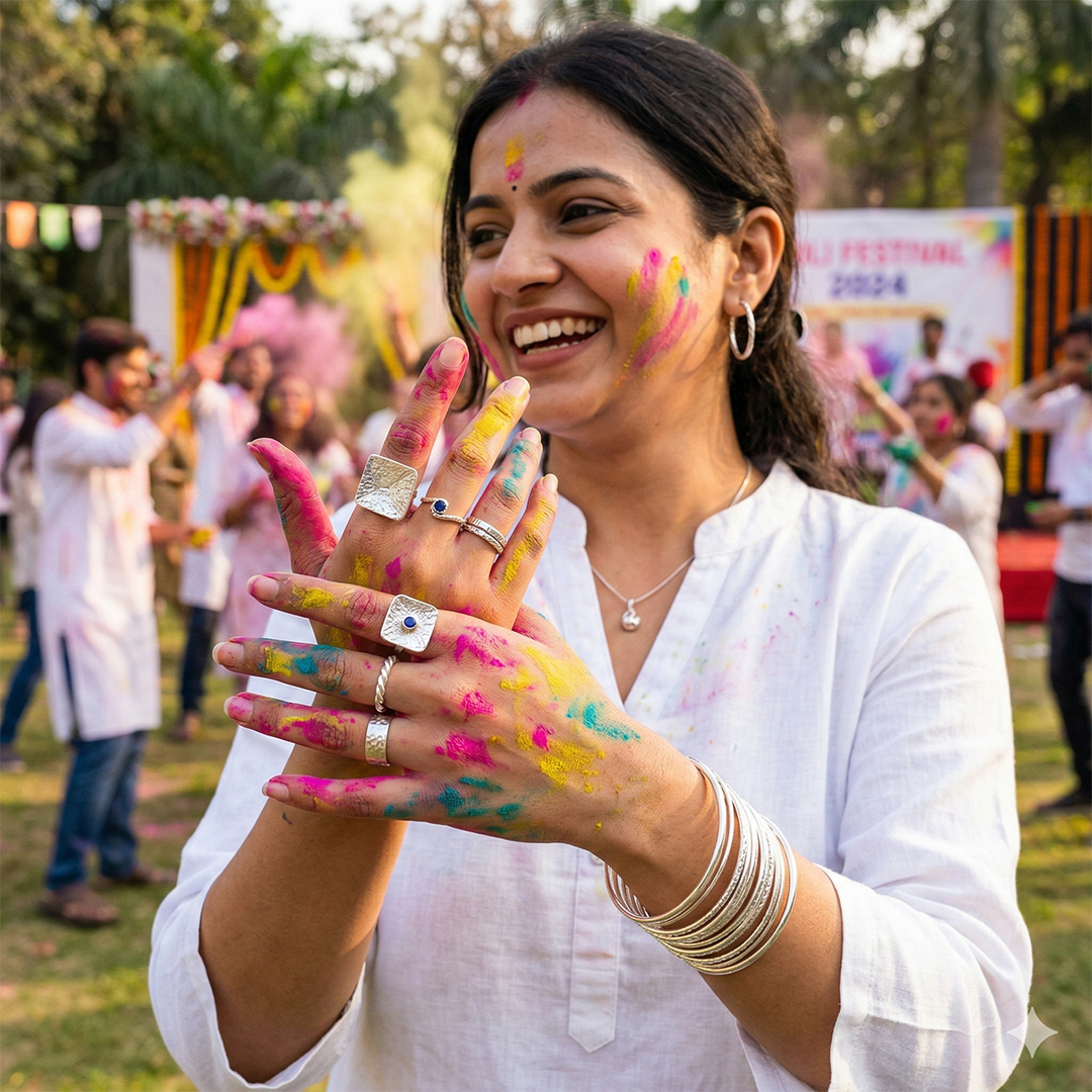 From statement rings to delicate pendants and elegant earrings, silver jewellery pairs perfectly with the vibrant shades of Holi.